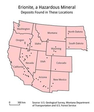 It cited studies in North Dakota. In 2005, it was revealed that erionite-laden gravel mined in the western part of the state had been used to cover hundreds of miles of unpaved roads.